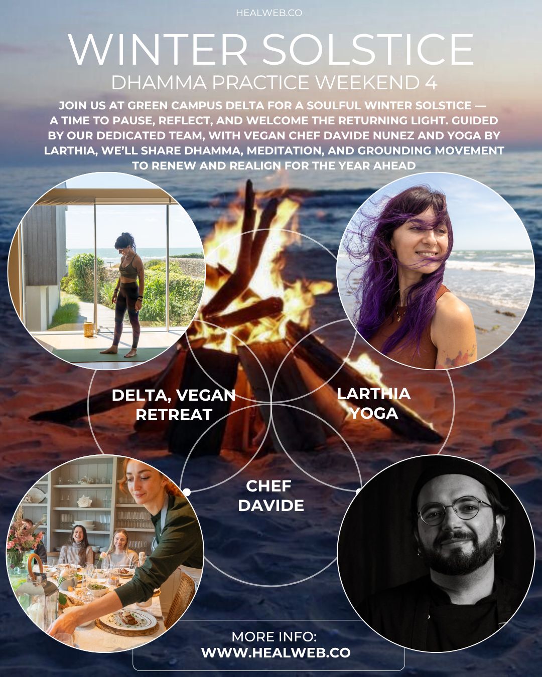 Join us for a special Winter Solstice Retreat at Green Campus Delta — a time to tune in, reflect, and realign with what truly matters. Together, we'll honour the longest night and the returning of the light, setting meaningful intentions to dance along the rising of the sap and the rest of nature. Guided by the same heartfelt team from Weekend 3 and our new team member, Vegan Chef Davide Nunez, with whom we have already enjoyed some very good projects together, the retreat will offer a steady rhythm of Dhamma practice, daily meditation and a variety of grounding yoga sessions, Yoga led by the incredibly well qualified and experienced Larthia.Vibrant, seasonal plant-based meals will involve elements of foraging, Davide and Ksenia's passion, offering time in nature learning to contribute to the lifecycle of the plants that evolved in partnership with us, that are all around. If not on the walks, enjoy the sanctuary of Delta, joining whatever of the four yoga and meditation sessions each full day you like, wild sea swimming, sauna ceremonies, the hottub or the fire overlooking the sea: providing space for rest and reconnection. This Winter Solstice retreat is an invitation to all who have journeyed with us and who are continuing to journey with us— to come together in celebration of a compassionate lifestyle, and to co-create an inspiring vision for the future inspired by the Dhamma, compassion and working in conscious co-creation with and respect for our mother nature who brought us forth.