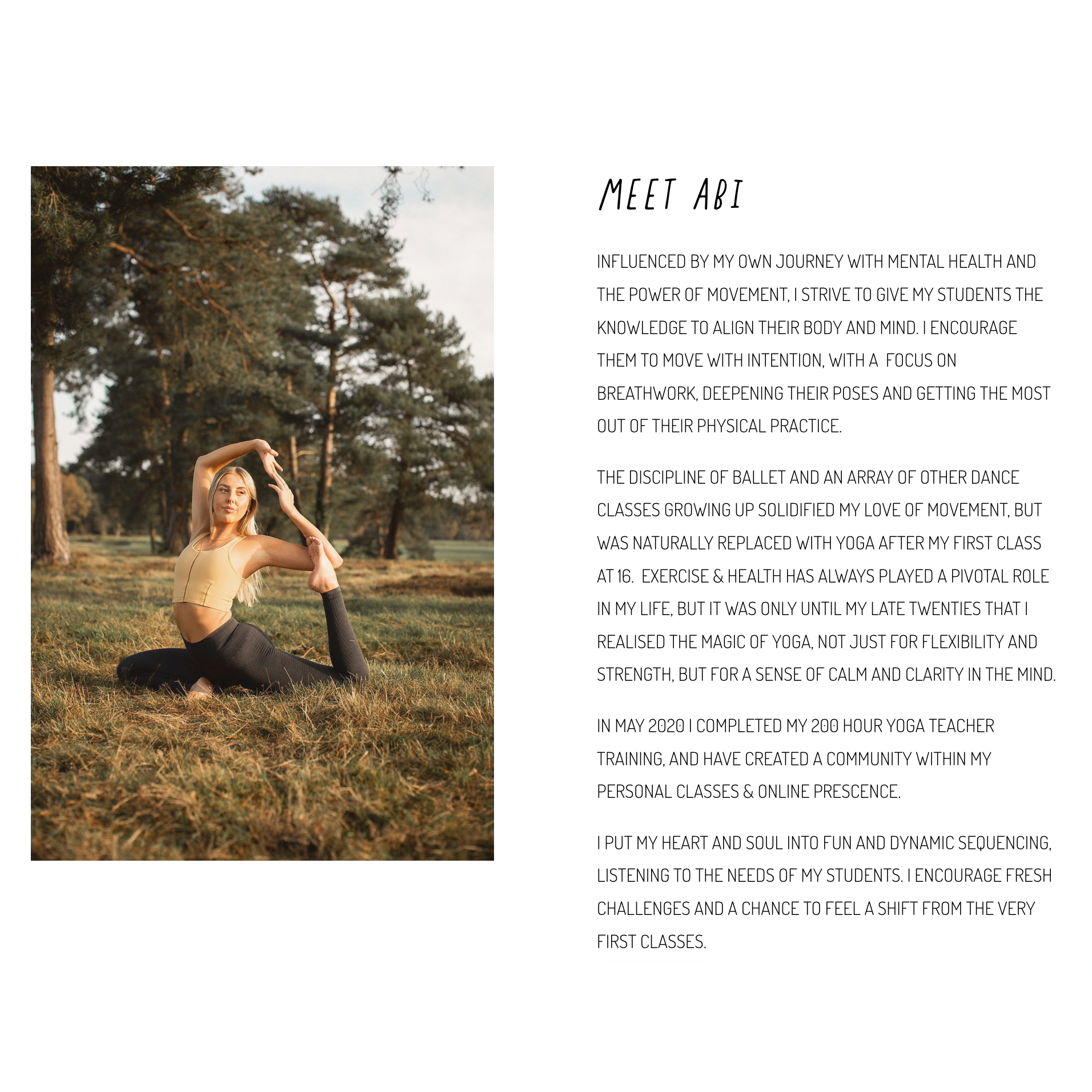 Abi uses yoga to find calmness and clarity, encouraging self-exploration and letting go in her classes and workshops running various international retreats that are widely celebrated.